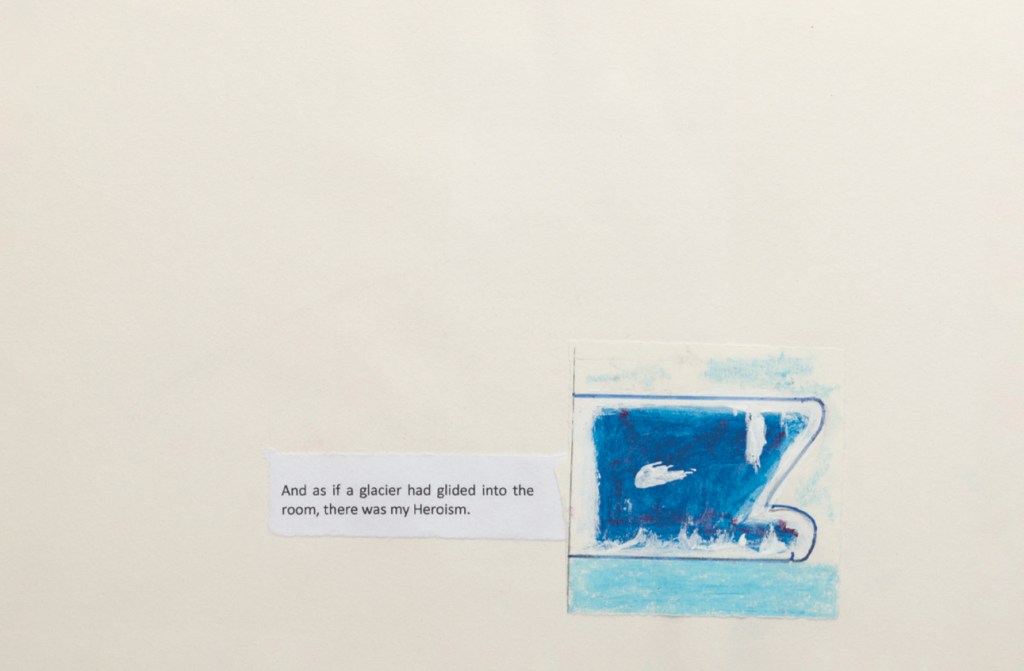 Following the conversion to a “true” heroism, H of H realized: “I could defy the universe and switch the focus onto me. Me as hero. The adrenaline was unbelievable.” The page that follows contains a curious rendering of a glacier, a dark blue shape, tinged with white and red, on a light blue base, and the text: “And as if a glacier had glided into the room, there was my Heroism.”