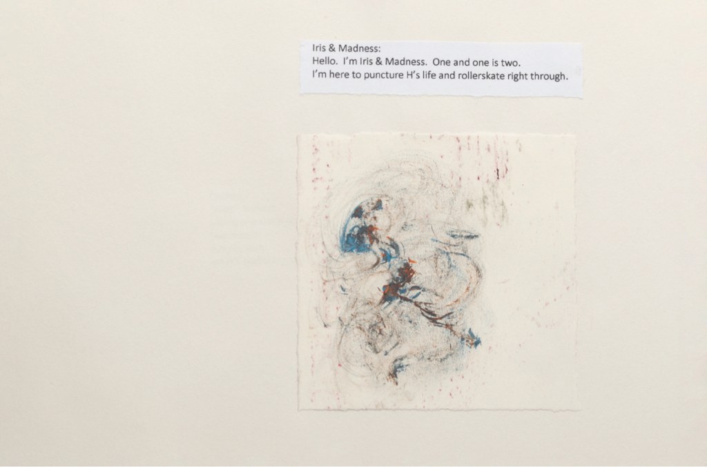 It’s also a “play in a book,” complete with color images that almost move, an intimate performance staged for one, in the form of a high-quality, color reproduction of a hand-made book. Perusing H of H, it appears the “original” book was about the size of a reporter’s notebook, turned to “landscape,” and had ecru-colored pages, upon which blocks of typed text, cut from white paper, were pasted. Many of the pages contain drawings and/or paintings—most also pasted in—some abstract, some figurative, and a few gestural images somewhere in between. The endpapers feature maps of Greece, with Thebes circled in red at the front of the book and Athens at the back, indicating Herakles’ move from Thebes to Athens at the end of the play. In both cases, the red marks appear to bleed through to the facing page. The pages are not numbered, and several are torn in half or so, both leading into the text and leading out at the end, possibly indicating the rising and falling of the curtain.