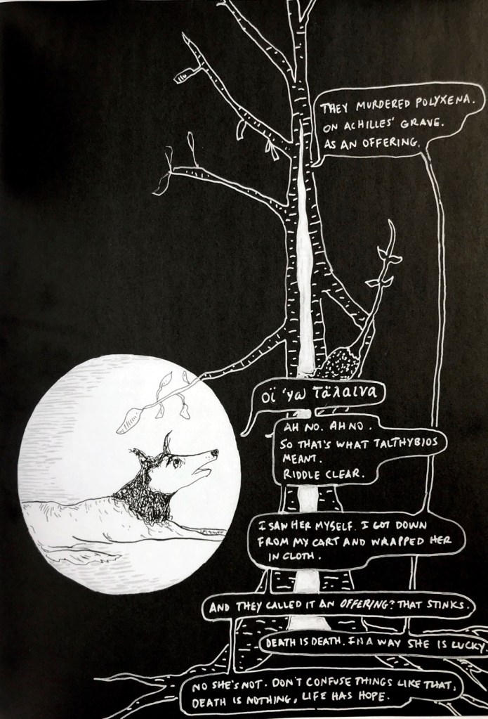 Most of the titular Trojan women and the chorus are portrayed as animals, indicating their “subhuman” status in the play, and the Greek army are “even less” human “ontologically and spiritually than animals,” so they are portrayed as “stuff and tools.”[2] These images are built into the text by Carson and realized in the comic by Bruno. Helen of Troy is portrayed as a fox; the goddess Athene is depicted as an empty pair of overalls with an owl mask; Kassandra as the one human woman; Menelaos as a gearbox, and Andramache, shown below, is portrayed as “a poplar tree with trunk split and roots dragging out the back of the cart.” Because this text is portrayed in comic form, speech bubbles are employed rather than dialogue tags, and at times it’s difficult to discern which line is attributed to which interlocutor, forcing the reader into a closer consideration of the moment (Who speaks? Does it matter?). The images create many moments of bizarre pathos, where the comic or absurd intersects with the tragic, like the moment depicted here, when Hekabe, in dog form, discovers, via the report of a broken poplar tree, that her daughter has been murdered on Achilles’ grave, “as an offering” (39). The image shows Bruno’s “spotlighting,” with a light circle on the page, of Hekabe, a formerly imperious figure, now almost always lying down. It also includes a signature move of Carson’s, the Greek cry, often translated as “Alas,” left in Greek, because, as Carson says, it is “untranslatable but not meaningless.”[3]