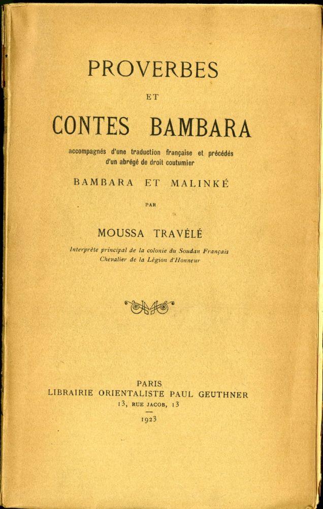 Another figure—connected to Maurice Delafosse because he worked for him—is Moussa Travélé, a native speaker of Bamanan who worked as an official interpreter for the French colonial administration. His 1923 publication of a collection of Bambara proverbs and tales (“contes” in French) with their French translation is the first published written translation of Manding oral literature of which I am aware.