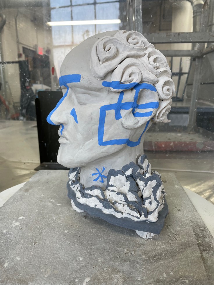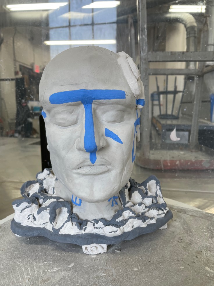 The four vertical planes of the face form the substrate upon which four key Chinese characters sit. The sides of the face are painted with the characters ไธ dong and ่ฅฟ xi. When these characters appear separately, they can be translated into English as east and west. They carry with them the sense of directionality, of space. However, when collocated, ไธ่ฅฟ dongxi comes to mean โthing.โ The words on the front and back of the head are, respectively, ไธ xia and ไธ shang, below and above. Placing them on the vertical planes of the face may seem weird, destabilizing. They carry with them the sense of verticality, of the relation between up and down. However, these words are also used to express relational positions in time. Last time is ไธๆฌก shangci, next time isไธๆฌก xiaci. In English there is no way to express time in a vertical orientation. What does it mean when the past is above, the future is below? The vertigo is almost unbearable.