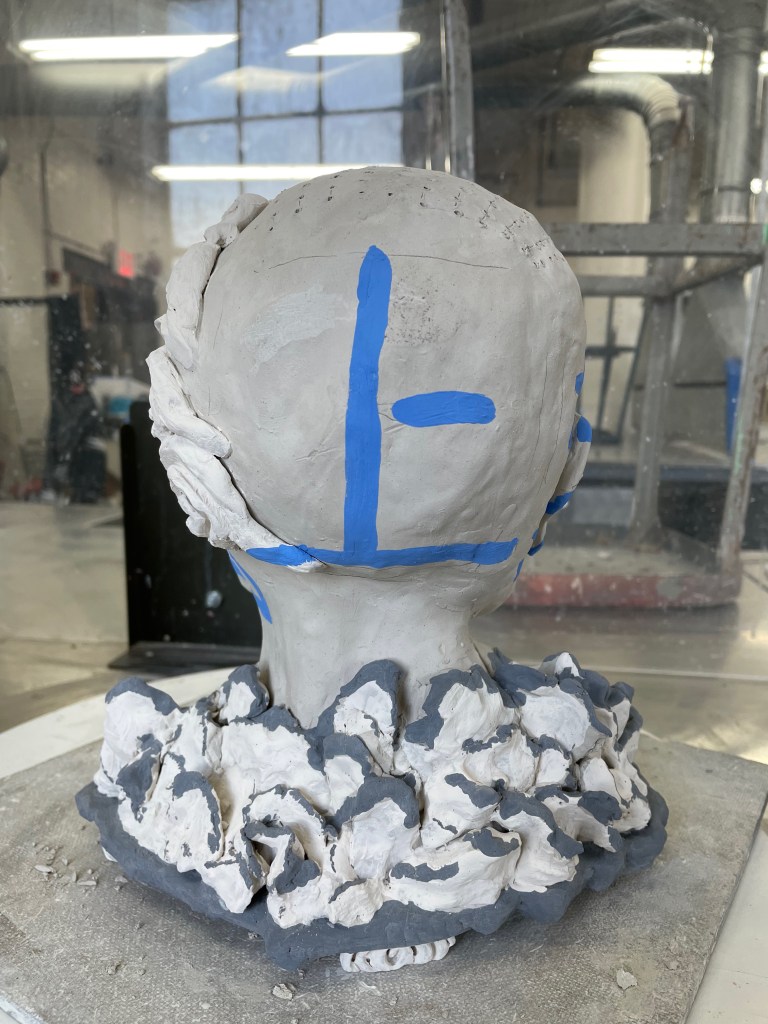 The words at the base of the throat are separately ๅฑฑ shan, mountain, and ๆฐด shui, water. Together they mean landscape. The head rests upon a rendering, a translation, of a Chinese scholar stone, a miniature representation of the world in which to project our journey through life, through the making of meaning. The words, the grammar we use, shape the way we understand that journey. Xiaolu Guo writes: โOne language is not enough to fully understand the world, just as knowing only one kind of climate is not sufficient to understand nature. As long as we live in one language only, we miss something in the worldโ (6). Yet how can one express the meanings that exist within and between languages? It is my hope that this experimental attempt at a transmediated translation of the array of time, space and subjecthood begins to do this.