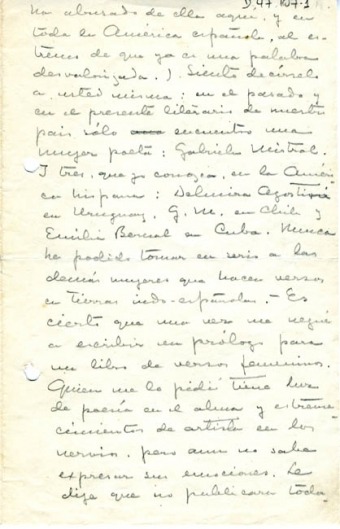 For a variety of reasons, this exchange of words was never made a concrete love. Over and over, despite his repeated invitations, Mistral opted not to make the decisive trip from the south of Chile to Santiago to meet with Magallanes Moure, and transfigure their passion of the mind into a physical one. Perhaps she found more meaning in communication by writing than in any union of the flesh; in the letters, she also describes her ups and downs from exaltaciรณn (which at different moments is linked to the carnal and the spiritual) and depresiรณn. In the end, she concludes, her aim is serenidad. Magallanes Moure, on the other hand, despite his lofty verses, was more down to earth in this respect, and one can feel his frustration at her repeated evasions of his hinting. At one point, he at last directly invites her to enjoy the straightforward pleasures of the body, but Mistral is horrified, saying she would only have him if they were surrounded by trees, in nature: