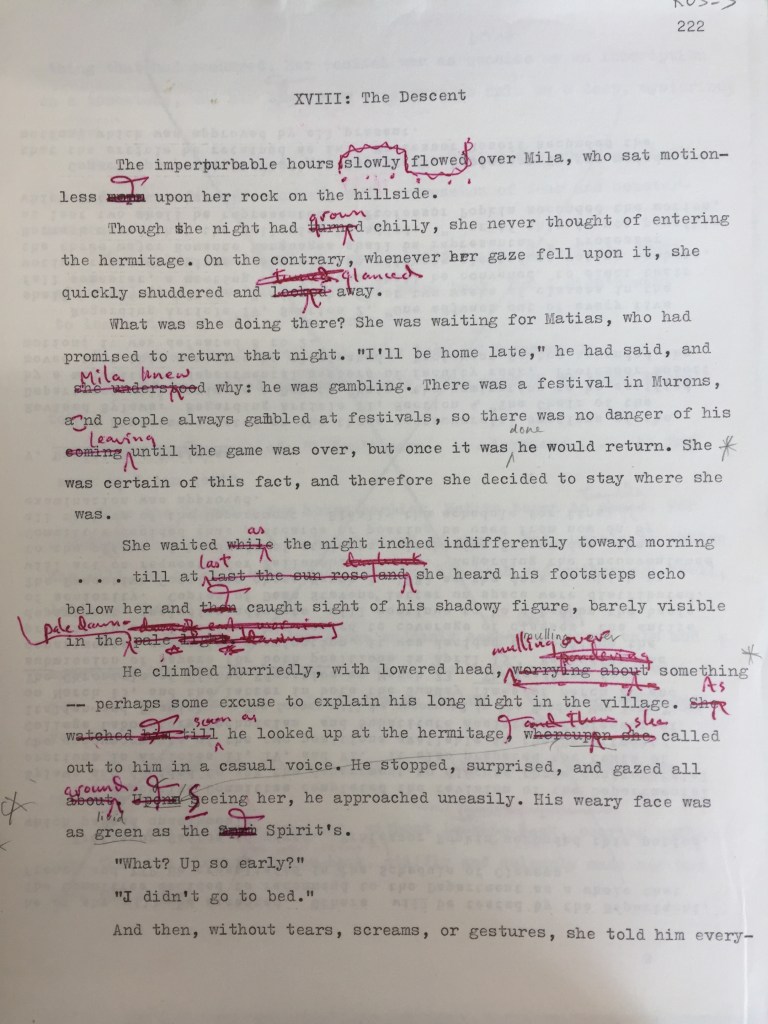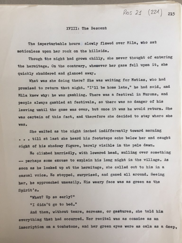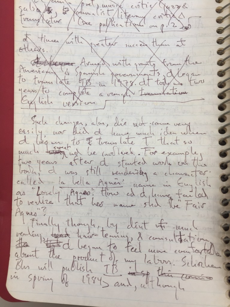 Another salient feature of these drafts is that simplifications never bend back toward more complex solutions, which would in many cases be closer to the original. There are moments where we see choices become more simplified, but never the reverse. (The only exception to this is that the Anglicization of Ànima’s name as The Spirit is reverted back, merely without the accent. If only the correspondence with the editor was also saved!) This is something worth pondering—or thinking about, or mulling over—for its implications: would the final product be better served by an approach that was more “foreignizing” in the Venuti vein, or literal, or “thick” in the Appiah definition, or just more time sitting with the messiness of a plain old awkward early draft?