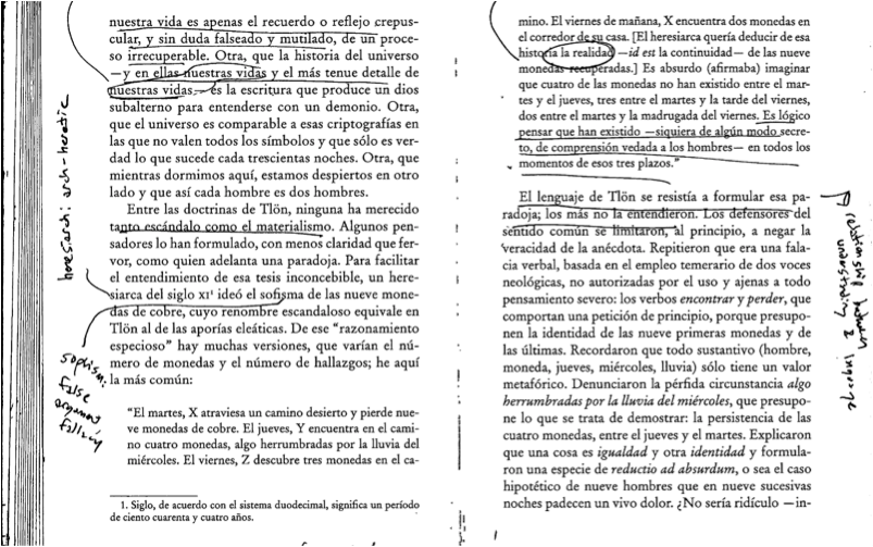 Such re-structurings of Borgesโ prose occur throughout the translated text; I will not attempt to catalog them thoroughly, but I will point out one more excruciating and particularly aggressive example. In โTlรถn,โ there is a passage where Borges introduces a refutation of the subjective idealism that governs its imagined universe: