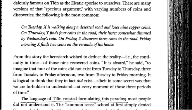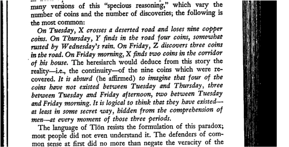 Tuesday, X walks a deserted road and loses nine copper coins. Thursday, Y finds on the road four coins, somewhat rusted by Wednesdayโs rain. Friday, Z discovers three coins on the road. On Friday morning, X finds two coins in the hallway of their home. [The arch-heretic wanted to deduce from this story the realityโid est the continuityโof the nine recovered coins.] Itโs absurd (he affirmed) to imagine that four of the coins have not existed between Tuesday and Thursday, three between Tuesday and Friday afternoon, two between Tuesday and Friday morning. Itโs logical to think that they have existedโif by some secret mode of understanding hidden to menโin all the moments of those three periods.