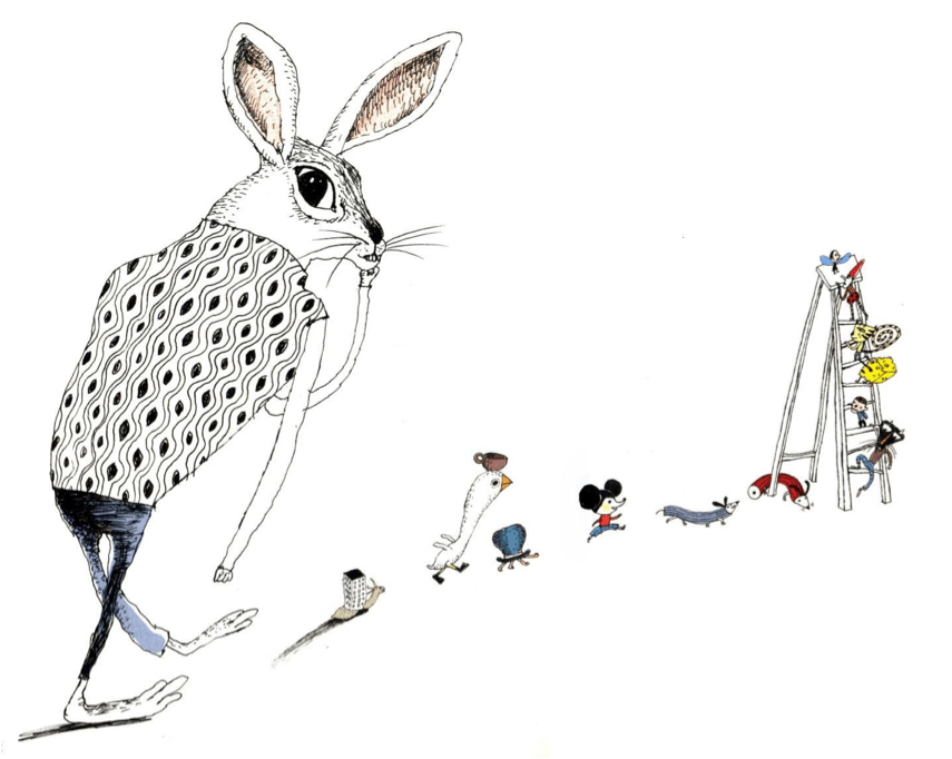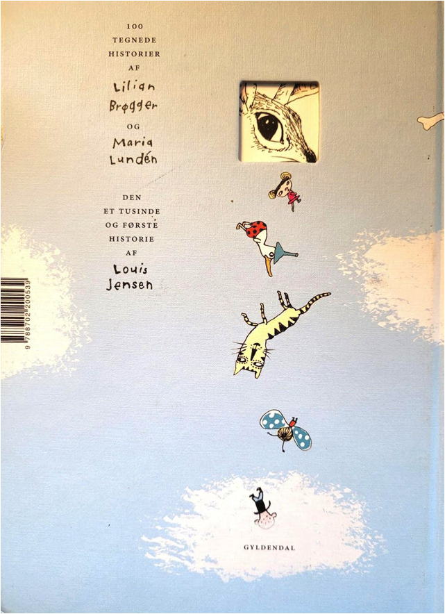 The eleventh and final book in the Square Story project expresses Jensen’s faith in never-ending stories in its very title: “Der er ingen ende – altid en ny historie” (“There is no end – always a new story”). The exuberant illustrations by Lilian Brøgger and Maria Lundén throughout the book refer back to the 1000 stories that have come before. There’s a hole in the front cover, with a menagerie of characters climbing a stairway up to the hole – on their way to entering the book – which you can see in the images embedded at the end of this interview. On the back page end paper, those characters are climbing toward a matching hole in the back cover, where perhaps they will escape the book and tumble into some new, unspecified story world. One of the characters is a perspicacious rabbit, who peers through the hole in the back cover when the book is closed. The book may close on the last volume of the Square Story project, but are the stories really over?