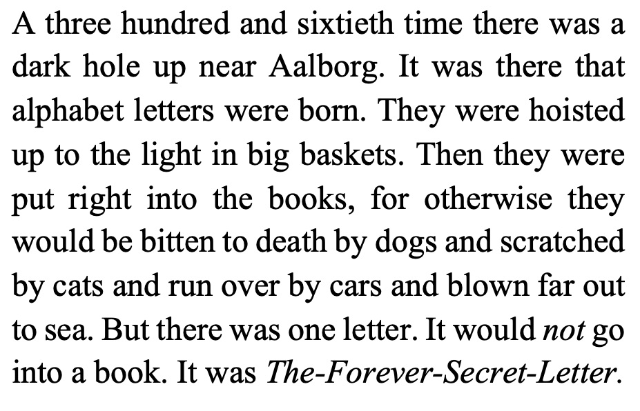 As a translator, I face particular challenges when it comes to these nouns – and even greater challenges with the pronouns. Danish has a gender-neutral possessive pronoun that English lacks altogether. And the Danish equivalent of the gender-neutral pronoun “it” gets used much more frequently and seems much less de-humanizing than the pronoun “it” does in English. If I assign the English pronoun “it” to the indeterminately-gendered characters, as I have in the stories of the town, the dragon, and the Forever Secret Letter, I run the risk of de-humanizing and objectifying them. But if I choose to use a standard “he” or “she” pronoun for these protagonists, I run the risk of confining them to masculine or feminine identities, and thus reinscribing cultural norms that are not actually present in the original story. I run the risk of shutting down some of the story’s possibilities and diminishing its weirdness.