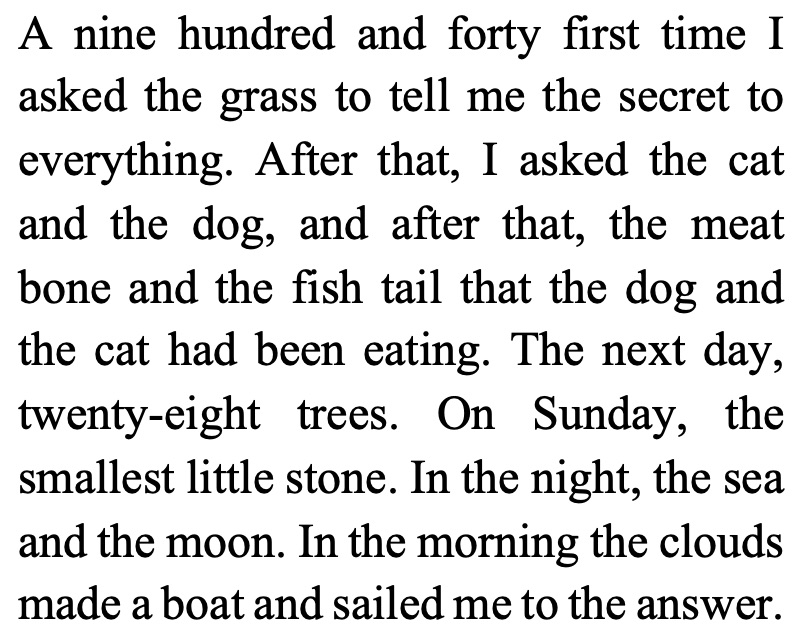 LK: In project poetry or contract poetry, the author begins by promising to adhere to a set of constraints, or, more positively, to fulfill a set of promises. Think of the magnificent long poem alfabet by the Danish poet Inger Christensen (English translation by Susanna Nied), which is structured on a Fibonacci sequence. [Christensen, Inger. Alphabet. Translated by Susanna Nied. New Directions (2001).] Or think of the poetry games and the ludopoetics of groups like Oulipo and other avant-garde writers and artists. By setting out to write 1001 stories, a project that took him a quarter of a century to complete, Jensen made a kind of a contract with his readers. And he fulfilled it.