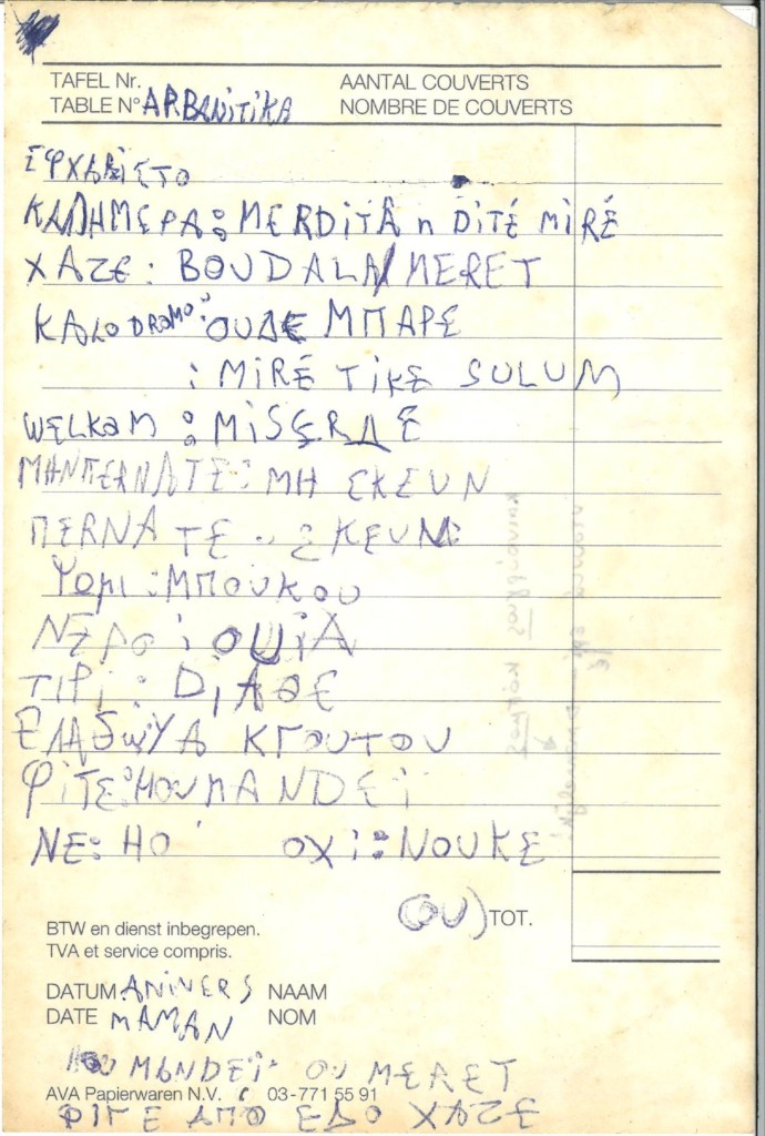 DH: People tend to look down on Arvanitika, referring to it as a bastardized mix of different languages: Medieval Albanian, Greek, Turkish, and a little Slavic. But on the other hand, villagers also claim that it was the world’s original language, that the first words Adam spoke were in Arvanitika, though they will often say this with a smile, and one wonders how serious they are. Anyway, when I asked my father what Arvanitika was, all he said was: “It’s a thing we used to speak back in the village.” When my father and godfather first mentioned Arvanitika that day at our Greek restaurant, they began to talk in it, haltingly, as neither of them remembered the language well after so many years. I began my first translation exercise then, a budding translator of eight, scribbling down words and phrases on a piece of crumpled paper, translating them into Greek and Flemish.