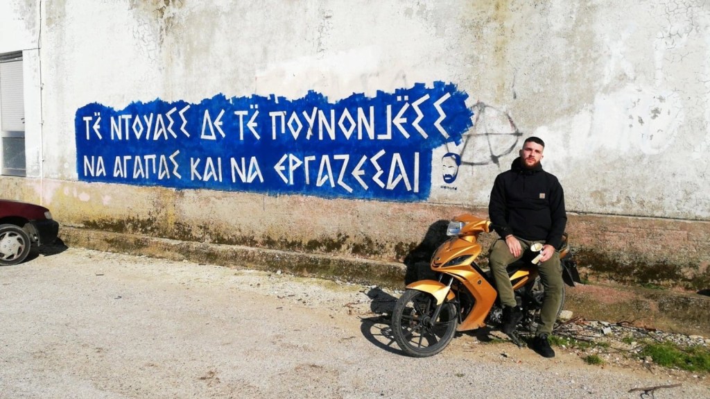 DH: Yes, but translating his three-word slogan turned out to be harder than I anticipated. I immediately ran into some basic linguistic hurdles. Or rather, I should use “we,” since my translations have always been a group effort, with me knocking on doors, asking elders for this or that word, this or that grammatical structure. The challenge was that infinitives do not exist in Arvanitika or in Modern Greek in the way they do in other European languages, so we translated the German phrase using a Greek grammatical pattern, τe ντούαςς δε τe πουνόνjeςς (të dùash dhe të punonjësh). Literally, “You should love and you should work.”