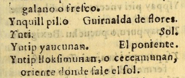 These missionaries, in other words, came to their ministrations with all the precepts and presuppositions of their time regarding language, non-Christian gods, the humanity of the people they encountered, and whether they possessed souls. Fray Diego Gonçález Holguín’s Vocabulario de la lengua general de todo el Peru llamada lengua Qquichua, o del Inca (1608) left out or distorted Indigenous concepts such as inti raymi, the sun festival, since the conquistadores perceived it as diabolical. Instead, Gonçález Holguín glossed “ynti” narrowly as “sun” (sol), ignoring the godlike qualities the concept Inti connoted: he simply eliminated the pagan god as referent. Gonçález Holguín, Ludovico Bertonio, and other missionaries found ways to translate confession, God, the liturgy, and so on by infusing existing Quechua or Aymara words with new meanings or by fashioning hybrid neologisms. They also included in their dictionaries telling phrases such as (my renderings in English) “There is always room at Mass,” “You haven’t been to church if you haven’t been to Mass,” and “Every time I think of God, I want to cry.” The bilingual dictionary was thus part of an effort to promote and purvey a Christian worldview and eschatology as truer than and spiritually superior to the subject epistemologies. Under the guise of a word-for-word symmetry between languages, the bilingual dictionaries imposed a hidden asymmetry.