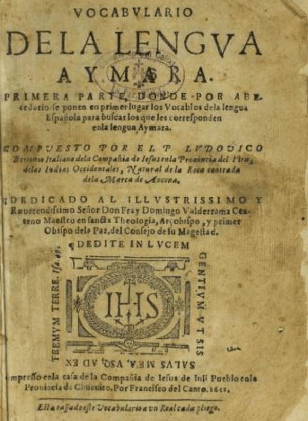 Bertonio, Ludovico. (1612) 2011. Vocabulario de la lengua aymara. La Paz, Bolivia: Radio San Gabriel / Instituto de Lenguas y Literaturas Andinas-Amazónicas.