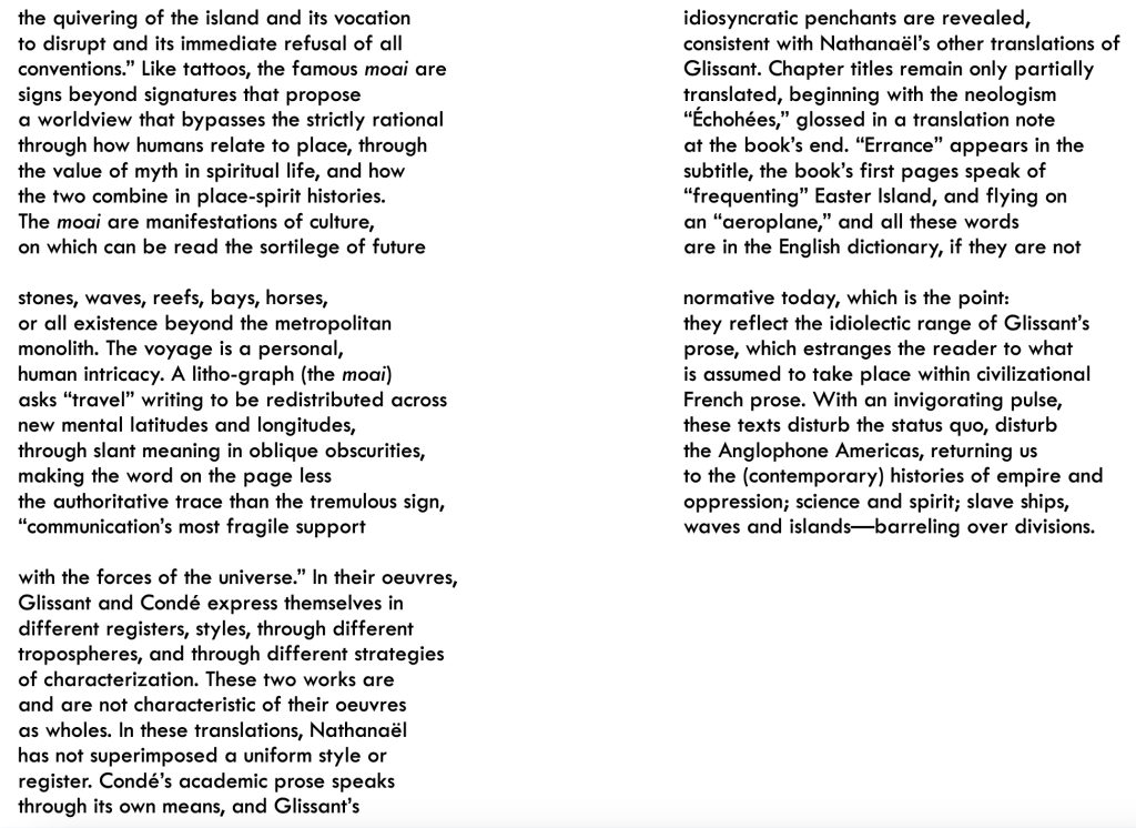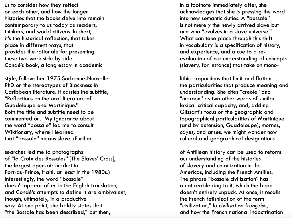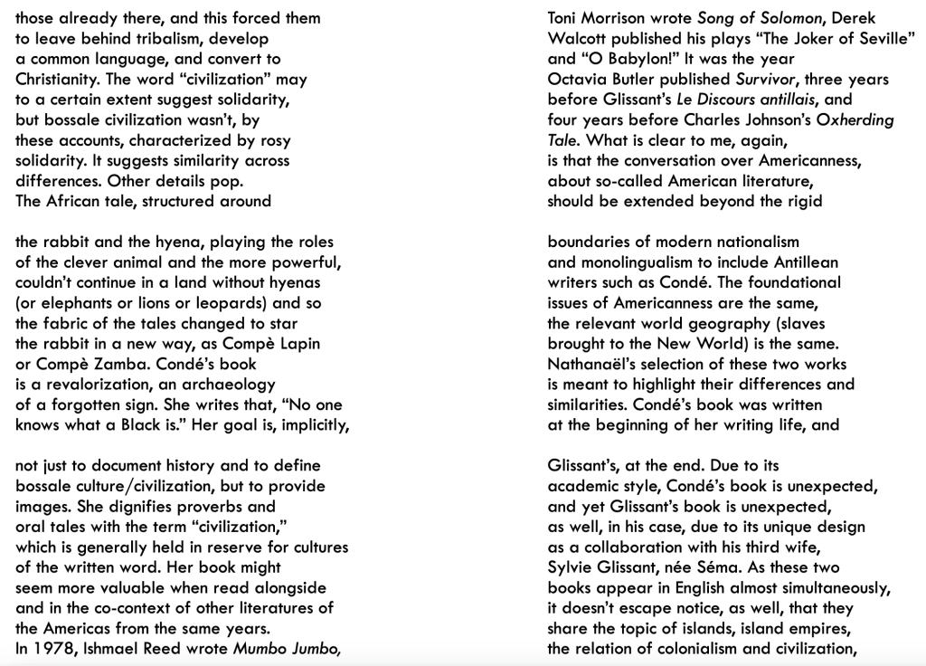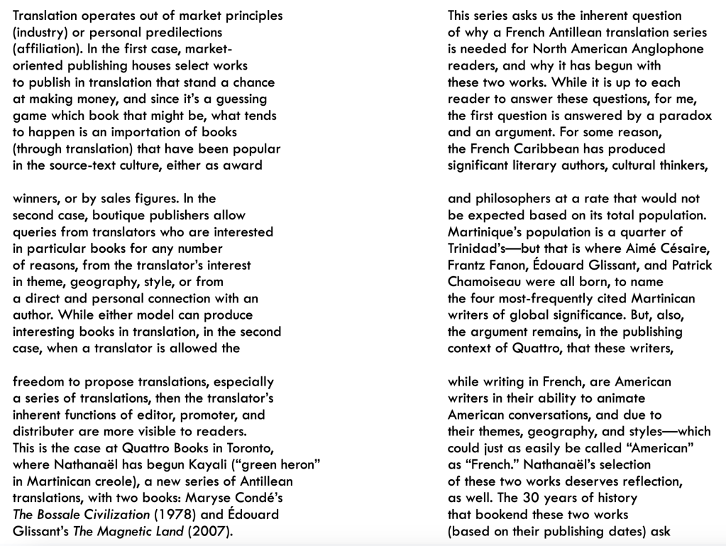 A review of Maryse Condé’s The Bossale Civilization (1978) and Édouard Glissant’s The Magnetic Land (2007), the first two books in Kayali, a new series of Antillean translations edited by Nathanaël and published by Quattro Books in Toronto.