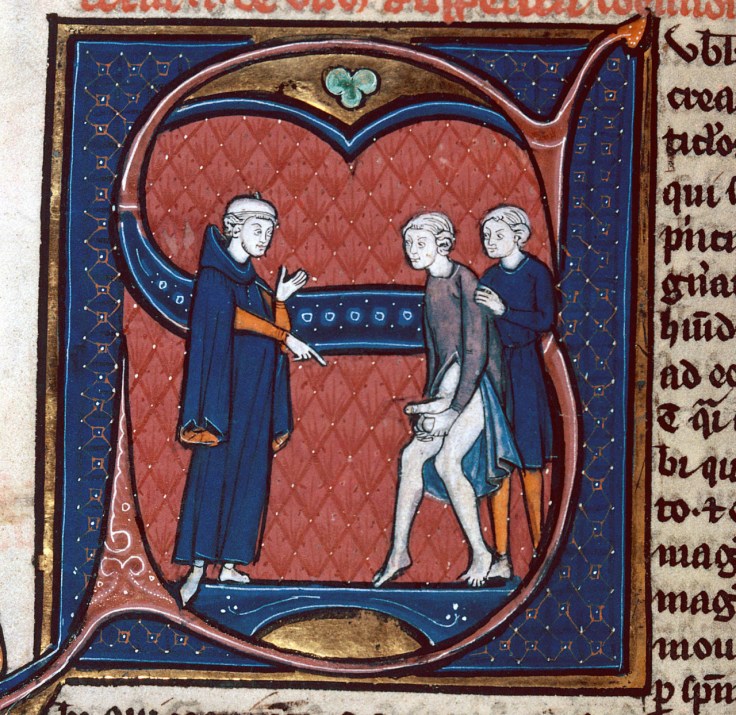 But what are we to make of another set of stage directions crafted by André Tissier, the brilliant editor of sixty-five Middle French farces in his thirteen-volume Recueil de farces françaises (Droz, 1986-2000), all of which he translated into modern French in the four-volume Farces françaises de la fin du Moyen Âge (Droz, 1999)? Picture now the title character of Slick Brother Willy, a promiscuous monk who beats a hasty retreat from a married woman’s bedchamber because—what else?—her husband arrives unexpectedly. When the Franciscan bolts sans underwear, Willy proposes to use his bare hands to support his “ball-sac” (sac à couilles). Willy or won’t he? The Middle French was so graphic that the original nineteenth-century editor of Ancien théâtre françois (Paris, 1854–57) declined to transcribe the key word. “I guess I’ll just have to make a fist,” ejaculates Willy, “and take my dick, Brother Willy, in my own two hands. Nature’s own jockstrap!” (Je prendray mon vit à mon poing; / Mes mains me serviront de brayette). But rejecting the words doesn’t come anywhere close to resolving the visual matter of what is happening on stage. How are we to get Willy off stage? Here is Tissier’s proposition in his modern French translation of Frère Guillebert: Willy “makes a sketchy sign of the cross that degenerates into a caress of his groin-area” and then “hides his organ with his hand.” Oh, really? What do you suppose that looked like?
