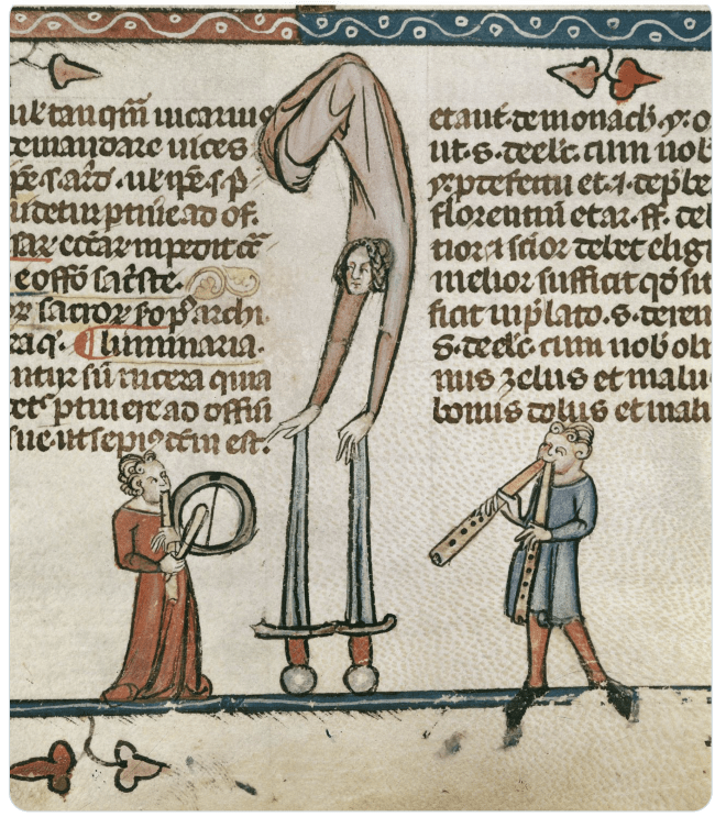 Acrobats, mimes, and musicians in the margins. Courtesy of the British Library, Royal MS 10 E IV. The Decretals of Gregory IX, edited by Raymund of Penyafort (or Peñafort), ca. 1300-1340, fol. 058r.