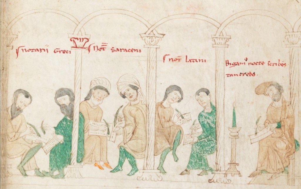 In what follows, I want to illustrate how rulers and administrators in twelfth-century Sicily experimented with the institutionalization of translation programs within the royal chancery to define the identity and project the authority of the newly created Kingdom of Sicily and how these efforts complicate the picture of Latin domination. In the early eleventh century, the island had a roughly even balance of Arabic and Greek speakers. When Norman warlords from Southern Italy invaded the island in the latter half of the eleventh century, they brought with them French, the language spoken in court, and Latin, the language of their administrative and intellectual culture. Initially, these warlords forged ad hoc relationships with translators to help them navigate Sicily’s complex linguistic terrain. As they formed a cohesive polity, they initially created an administration primarily staffed by multi-lingual Greek Christians. In the 12th century, this administration shifted to include Latin Christians, Greek Christians, and Muslim notaries. These court notaries communicated the messages of Sicilian rulers to diverse audiences on the island, to their holdings on the Italian mainland, and populations across the Mediterranean world through various forms of public writing, often translating the words and symbols between their diverse cultural constituencies. Two programs of translation, one administrative and the other intellectual, illustrate the importance the twelfth-century court placed on translation and the development of professional institutions for translators. Historians have frequently studied these two translation projects in isolation, even though many of the same administrators were involved in both programs. Looking at them together illustrates the way the Arabic linguistic traditions of the island persisted, and even expanded, under Latin Christian rulers.