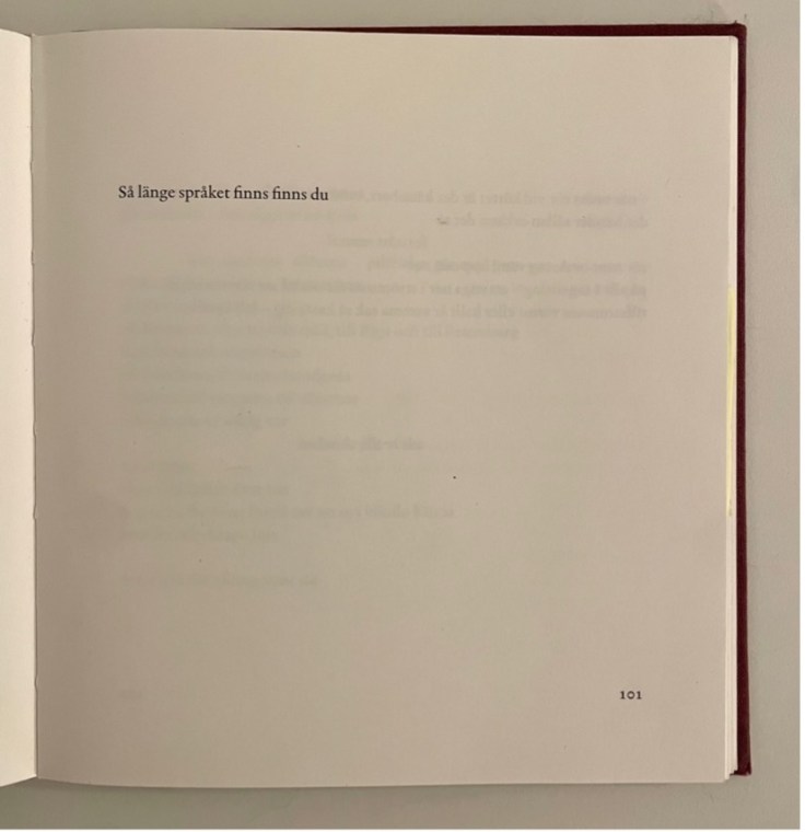 Yet English feels less adamant than the Swedish to me for a few reasons. The first is that there is now no adjacent repetition of finns (exist), no side-by-side emphasis uniting language’s being with your being. If we abide by the rules of English syntax when transferring this Swedish phrase, language exists and you exist but never the twain shall meet. The second finns doesn’t vanish, but it does move, it comes later, ever so slightly delayed. It’s also worth noting that, despite its existential assertion, this phrase is uniquely intimate, with its apostrophic address. The poem is making a universal claim, yes, but it is speaking to you.