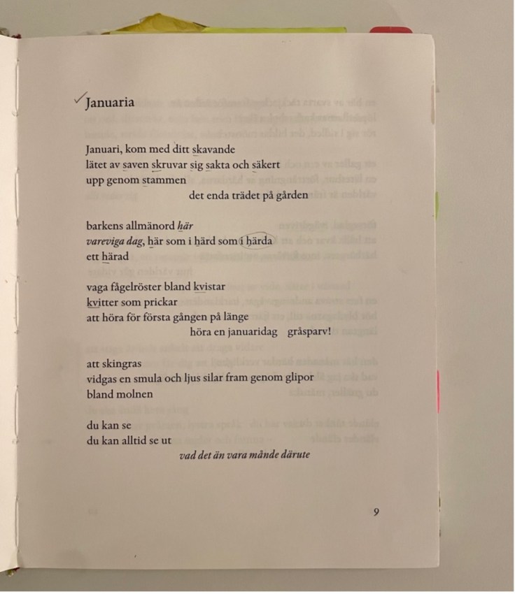 I mentioned above that Frostenson’s poems are often propelled by sonic associations. One such instance appears at the very beginning, in the opening poem “Januaria,” where each of the first two stanzas are oriented around a single alliteration: the first with the alliteration of initial /s/ and second with the repetition of the word här (here), each marked in the Swedish text below. Each conjures an almost propulsive rhythm (especially in combination with the arrangement of long and short vowels and syllable stress).