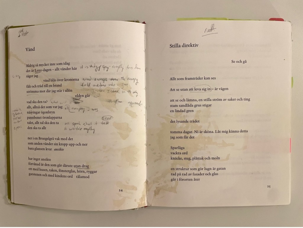 These examples are representative of the intricacies of Frostenson’s writing, and how a small detail can be connected to an entire ‘phase’ of her career. As a general principle, because I can’t replicate every trick or clever phrase that she makes in Swedish, I tried to tease out ambiguities and wordplay whenever I could in English. And without sacrificing sense, I tried to emphasize sound whenever possible.