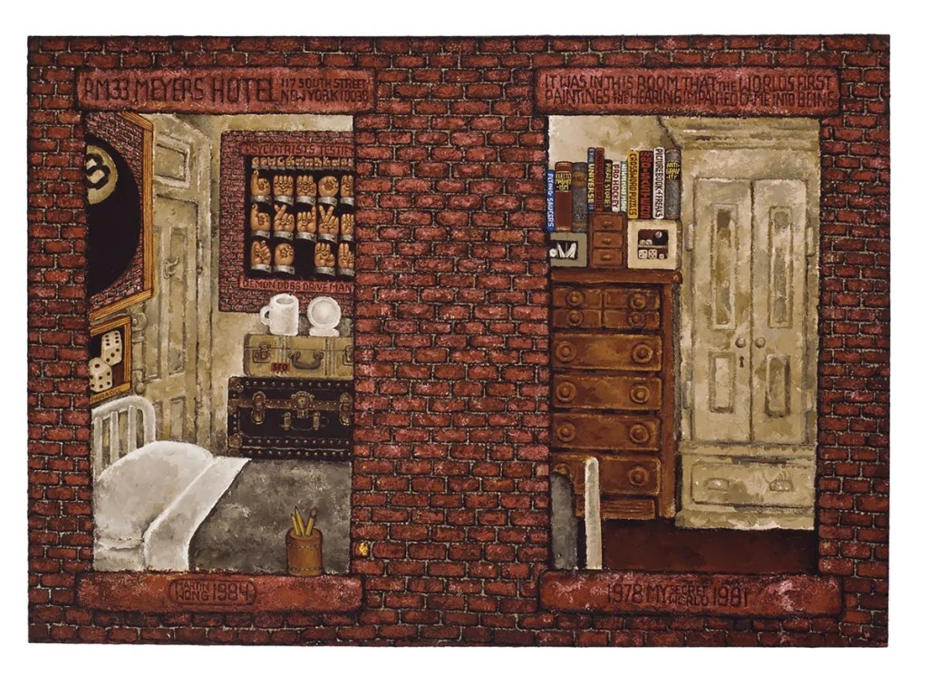 To paint English or Spanish language, to paint bilingually, is not in and of itself new to the Western painting tradition but it is innovated by Wong’s equal treatment of the ASL manual alphabet and graffiti—two visual languages—which foil the English and Spanish as points of immediate legible narrative, ports of entry into the composition. He spells the painting and images the language. And to further define Wong’s innovation, the artist not only converts an alphabetic language to a pictorial domain, but in that conversion assigns functions to each language that cues narrative devices which sublimate that tension of the partly opaque, partly see-through environment. In a seminal work depicting the artist’s room in the Meyers Hotel, My Secret World 1978-81, Wong positions the viewer outside the brick façade, looking in on his collection of books and ASL paintings through two windows. This painting, which historicizes the room where the first manual alphabet paintings were developed, assigns exactly that half-guarded dynamic with the viewer. Jon Yau writes in his essay for the publication of Human Instamatic, “By turning viewers into voyeurs, the artist emphasizes that looking is not innocent, and that there is no such thing as an innocent eye, rather, there is a gap (or partial barrier) between the viewer and viewed. Wong is positing a dilemma between telling and withholding, which lives at the heart of all art” (Yau 38).
