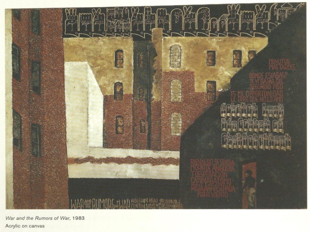 A painting from 1983 shows a slightly different operation happening. In the case of War and the Rumors of War, Wong depicts a figure modeled off Piñero in the foreground of a dark wall slipping into a glowing red doorway. The entire canvas is blocked out with brick and building façades, overlapping and crowding the airspace: there is indeed no room for natural things in this vision of New York and just like his other works, the sky is choked with gilded hand-letters. On the bottom of the picture Wong paints in yellow the title, the cross street, his name and phone number: “WAR AND THE RUMORS of WAR HOUSTON NEAR THE CORNER of CLINTON STREET MARTIN WONG 5989883.” This text is doubly encoded in the sky and again on the silhouetted angle of the building where Piñero is slipping into a doorway. About and below those painting hand-letters which mimic the location, Wong renders text in Spanish that describes the action of the painting: