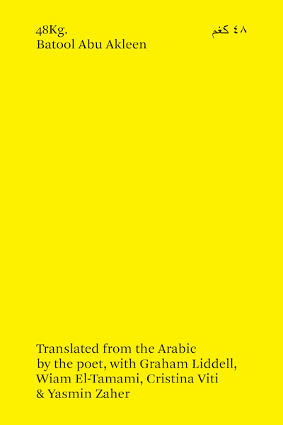 48Kg., by Batool Abu Akleen, translated from the Arabic by the poet, with Graham Liddell, Wiam El-Tamami, Cristina Viti, and Yasmin Zaher. Tenement Press, 2025, 135 pp., £17.50. ISBN 978-1-917304-03-0